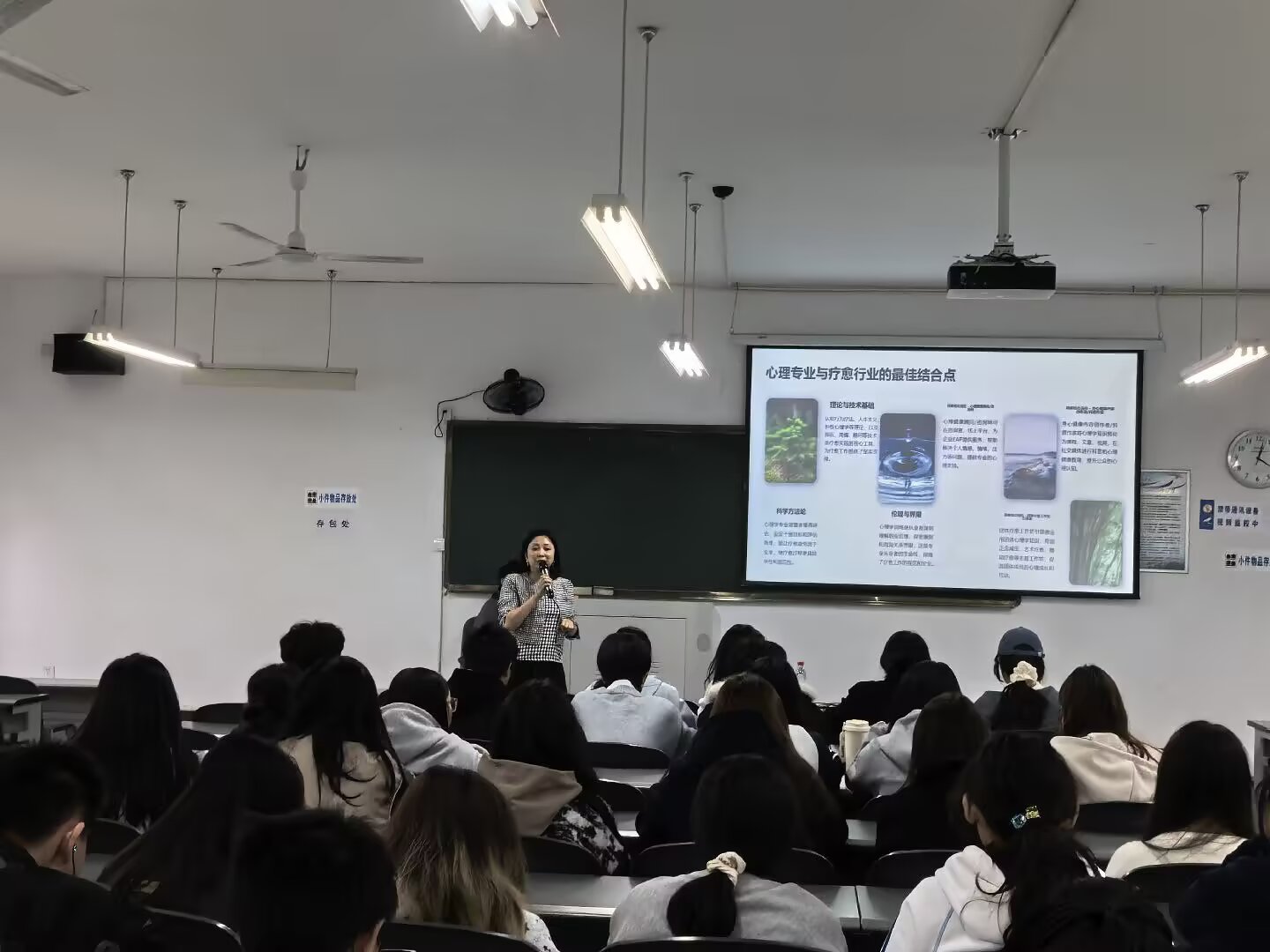 本次讲座特邀川商传媒专栏负责人、宿心疗愈联合创始人鄢婷担任主讲。鄢老师结合自身丰富的行业经验,剖析了心理学专业的就业前景与市场需求,并围绕宿心集系列实践活动,详细解读了疗愈师职业的工作内容、岗位要求及发展路径。她指出,随着国家对心理健康工作重视程度不断提升,疗愈师的发展潜力与市场空间日益凸显。