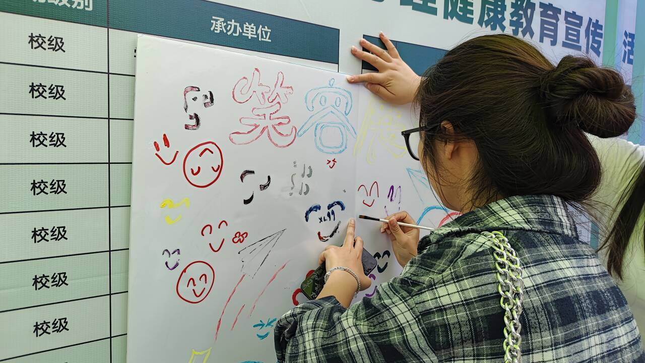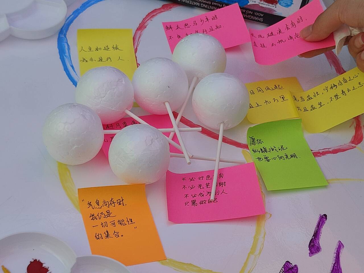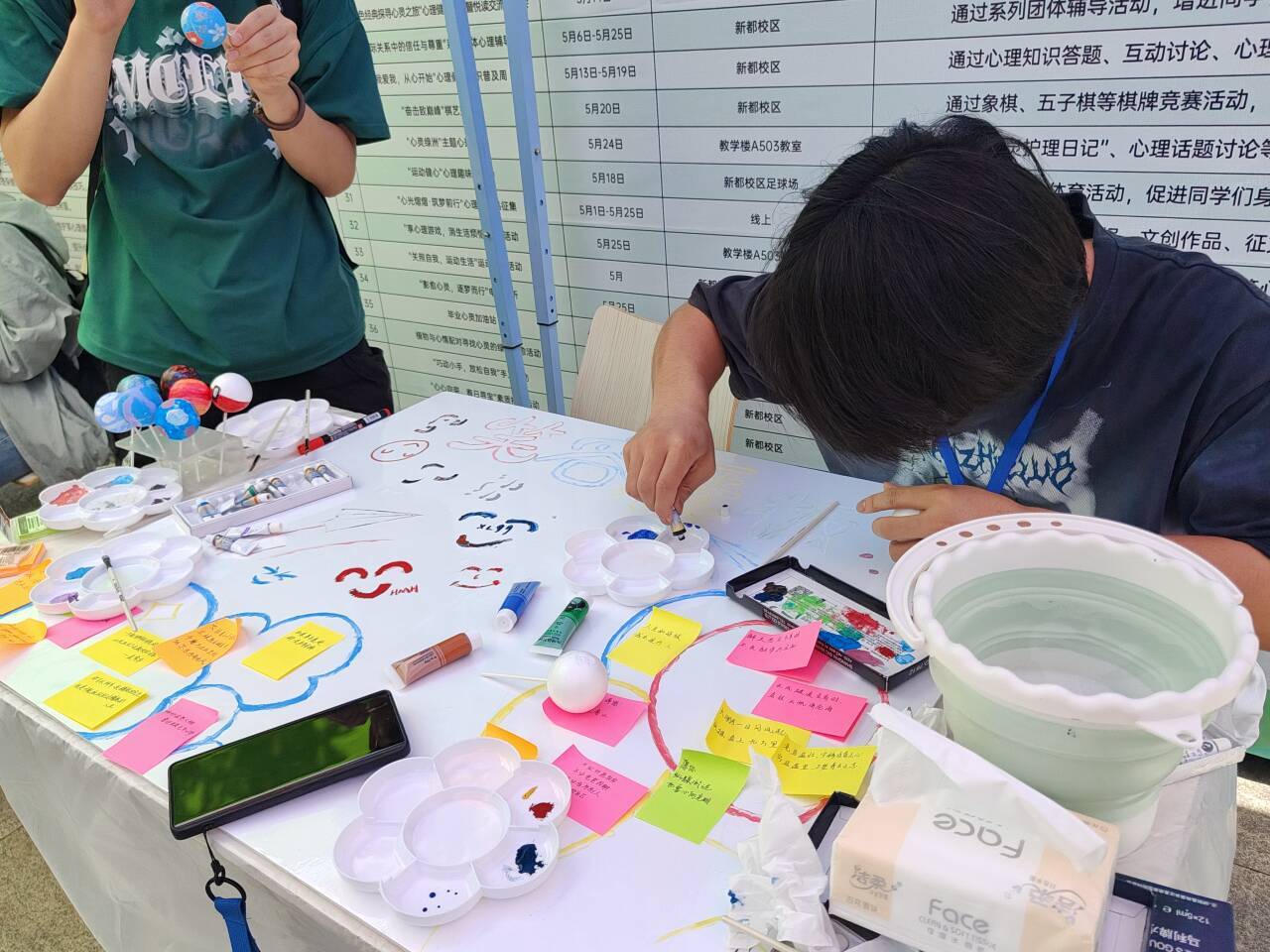 活动由两个精彩的环节共同编织,相辅相成,让同学们在绘画过程中释放压力,感受心灵的宁静与自由。第一个环节是展板笑容绘画,同学们在展板处凭自身喜好手绘一个笑脸,同时留下暖心激励纸条,粘贴在展板上。第二个环节是心灵魔法星球制作,同学们使用现场颜料,给泡沫球上色,也有同学在球上写下自己的名字缩写,制作专属自己的魔法星球。在每个环节中,同学们都喜笑颜开,表示活动非常新颖有趣,自己身心获得了放松。最后同学们满怀欣喜地与自己的作品进行了合影!