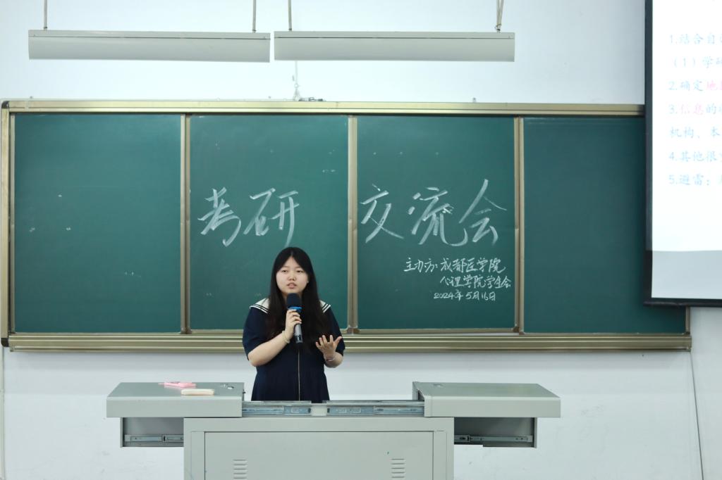 在本次分享交流会上,2020级应用心理学本科班黄继成、唐艺玮、闫琬淩、胥知雨四位学长学姐分享了自己考研的基本情况和备考经验,有的结合自己的择校经验向大家传达了不同院校的备考方式和注意事项,有的结合自己的调剂经历向大家强调了初试复试的比重以及充分利用本校资源的重要性,有的建议大家结合自己的职业生涯规划进行专硕学硕和学校选择。与此同时,每位学姐学长都分享了一些考研备考的时间安排、注意事项和实用书籍、APP等。分享结束后,低年级的同学们提出了自己在考研备考方面的一些困惑,并且得到了细致的解答。