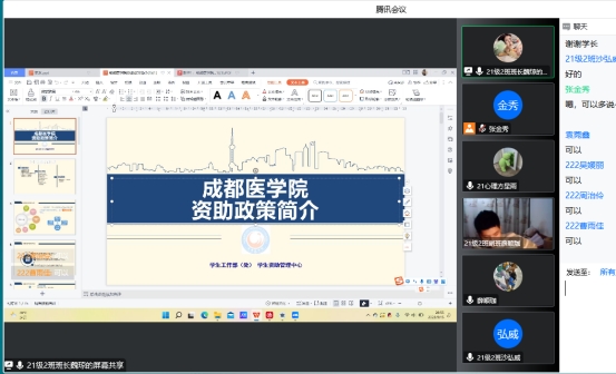 学生资助管理中心程兰老师给同学们介绍了必赢实施的大学生资助政策,其中重点介绍了国家资助、学校资助和社会资助的种类以及申请方式。2021级2班班长魏琼则在此基础上给同学们分享了具体的申请步骤、操作方法和需要准备的材料。