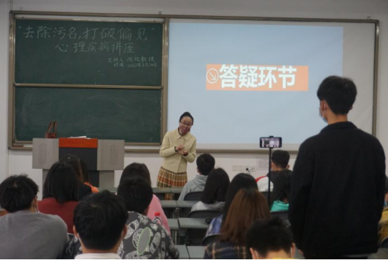 陈老师生动形象地讲解了心理疾病的疾病谱系及相关病例,其中重点对抑郁症、焦虑症、精神分裂症、儿童青少年心理行为障碍等精神疾病的症状、表现进行了详细阐述,并且多次强调:很多心理疾病是由生理或先天遗传所致,并且非常普遍,希望同学们以更加包容的心态对待患者。最后,陈老师就心理疾病患者的法律责任进行了科普,同时也就同学们心中的疑惑进行了解答。