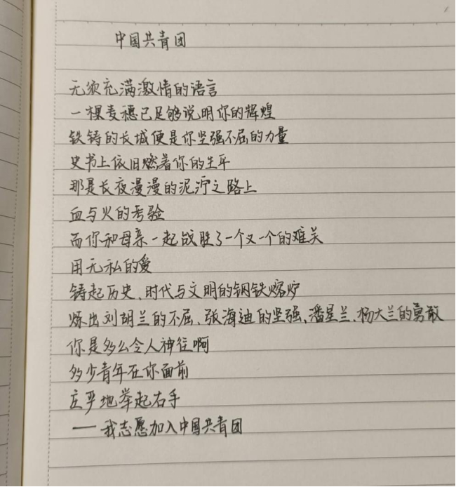 同学们通过辞趣翩翩的句子、行云流水的书法真情实意地表达了对祖国日益繁荣和对中国共青团愈发强盛的赞颂,同时还展现了自己的决心以及对未来的期盼。