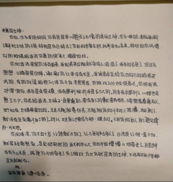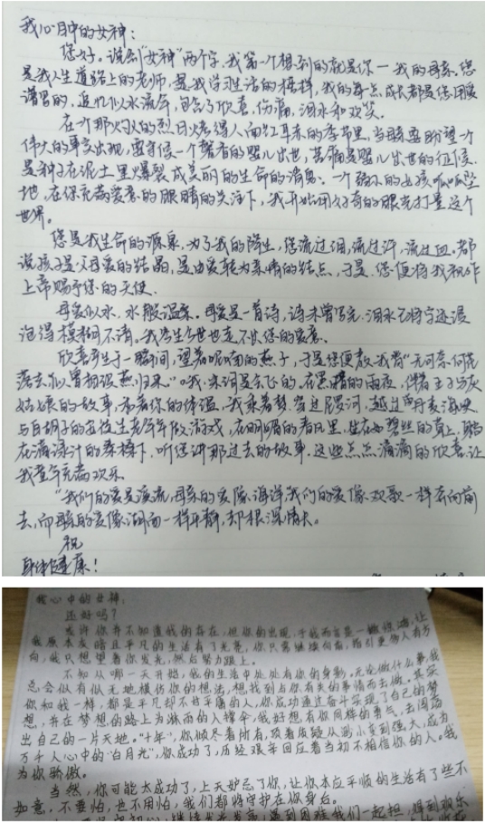 活动期间,同学们以手写信笺的方式表达了对自己心中的“女神”的祝福与慰问。一些同学表达了对母亲的感激,一些同学表达了对伟人、偶像的崇拜,一些同学记录了自己或其他女性的成长经历,描述了一段段耐人寻味的故事······信笺中满是真切的祝福,饱含着对亲人、朋友、爱人以及广大女性同胞的关爱和激励。