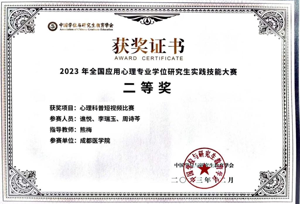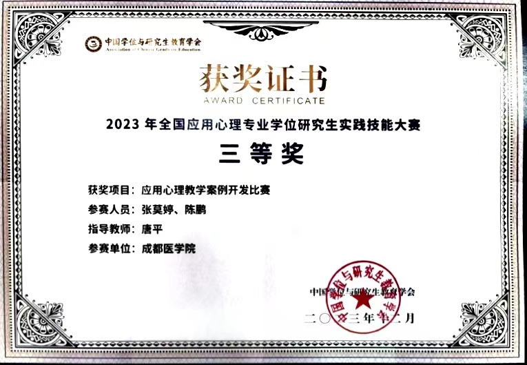 近日,在2023年全国应用心理专业学位研究生实践技能大赛中,437ccm必赢国际官方网站师生荣获佳绩:谯悦、李瑞玉、周诗芩团队(指导教师:熊梅),荣获心理科普短视频比赛全国二等奖;张莫婷、陈鹏团队(指导教师:唐平),荣获应用心理教学案例开发比赛全国三等奖。