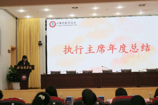 学院团委学生会执行主席徐露丹代表学院团委学生会作年度工作汇报,从组织建设、思想引领、宣传工作和学风建设、体育工作、文化艺术这六个方面向大家作了详细汇报。