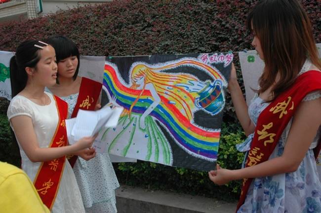 本次共有来自学校八个院系及个人共32幅优秀的作品参赛,各位选手,想尽奇招宣传心理健康活动月“拥抱自然,和谐心灵”这一主题。此次活动将所有作品在篮球场展出,吸引了众多老师和同学驻足观看。在各个讲解员的精彩解说下,评委团进行现场评比,并给予这些优秀作品高度赞扬。