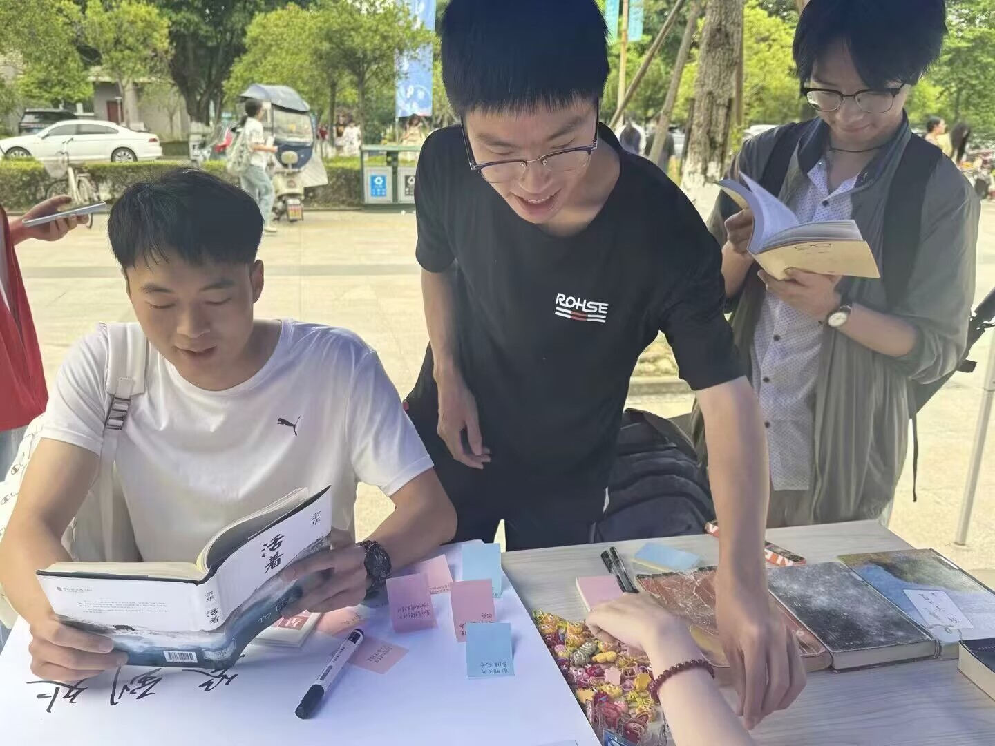 以书为媒,疗愈心灵。此次活动设置了三大互动环节,传递心灵温度。分别为“书海畅游”“志友相伴”以及“赠人玫瑰”。在“书海畅游”环节中,同学们纷纷在签名板上写下推荐书目,从经典文学到心理学著作,一本本书名串联起参与者对阅读的热爱与思考。在“志友相伴”双人组队环节中,参与者从工作人员提供的书籍中随机选取一本,共同品读经典片段。在短暂的共读时间里,原本陌生的两人因对同一段文字的感悟而悄然拉近距离。这一环节通过“协作阅读”的形式,让参与者在文字中寻找共鸣,打破社交壁垒,重拾现实互动中的温度与默契。最后在“赠人玫瑰”环节,白板上贴满了同学们手写的触动话语,从“世界喧嚣,但你可以选择宁静”到“成长是学会与孤独共舞”,每一张贴纸都承载着温暖与力量。